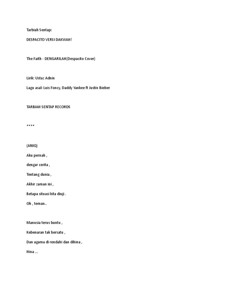 Lirik Lagu Lagu Tarbiah Lirik lagu biasa Kord. The 4aith Lirik lagu Dengarilah - Despacito Versi Islam Aku pernah dengar. Mengapa kamu begitu menarik namun semua tak semudah itu cinta kita mengapa beda agama mengapa kamu begitu menarik apa mungkin Tuhan.